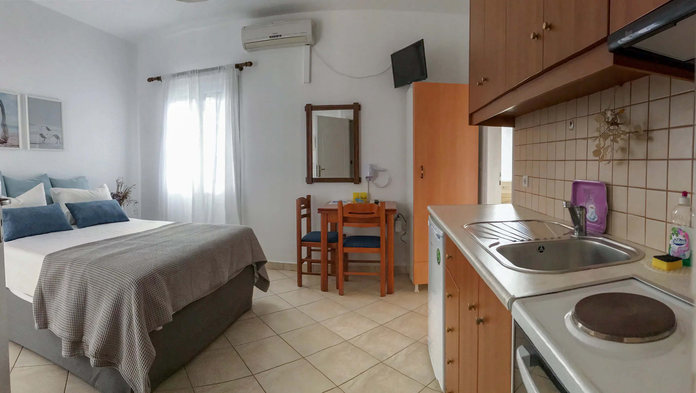 The Studio with terrace is situated on the ground floor and opens to a small terrace where you can relax and enjoy the serenity of the village. This Studio does not offer sea view.